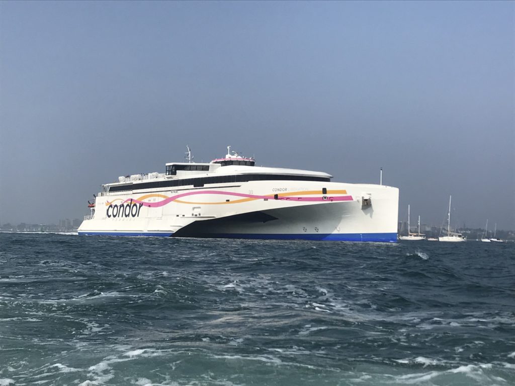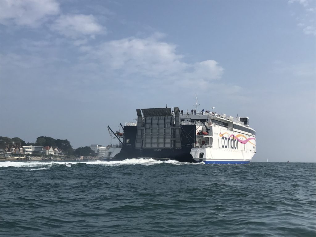 Poole Harbour(プール港)というヨーロッパ最大の港の近くを通過中。。。巨大なフェリーが接近!