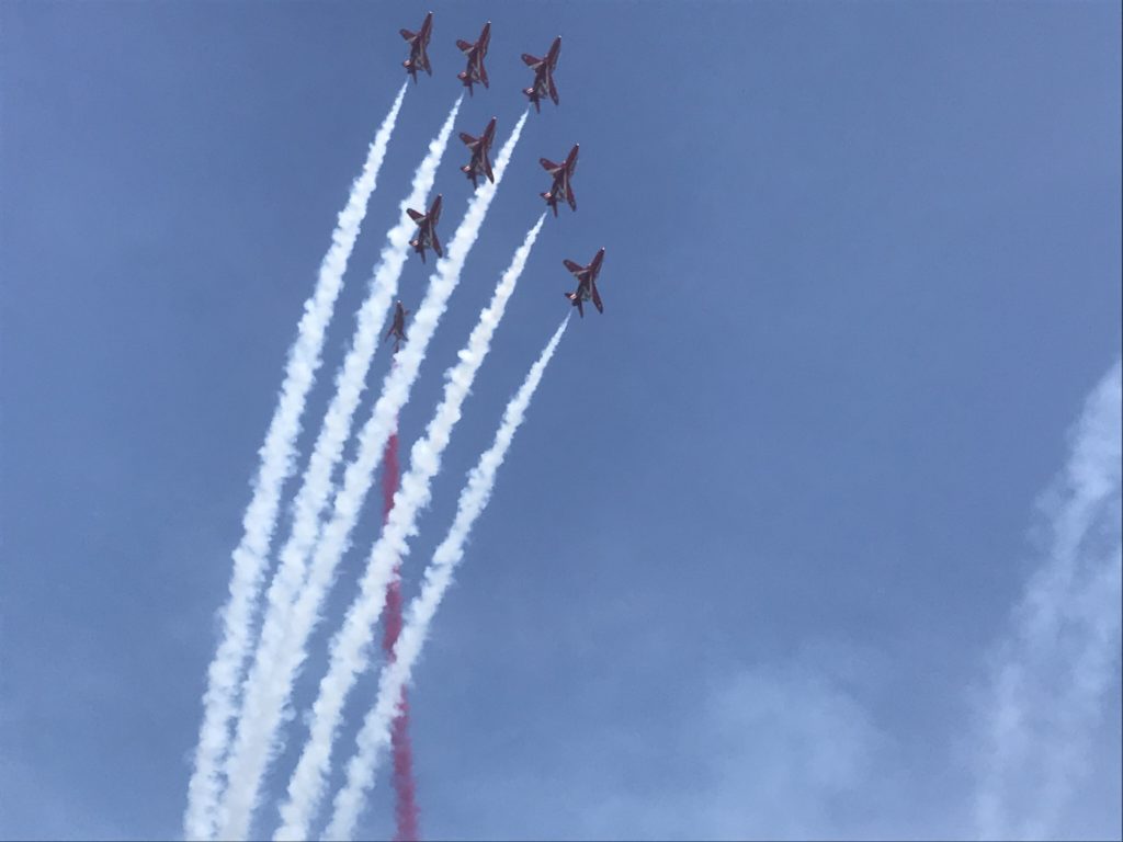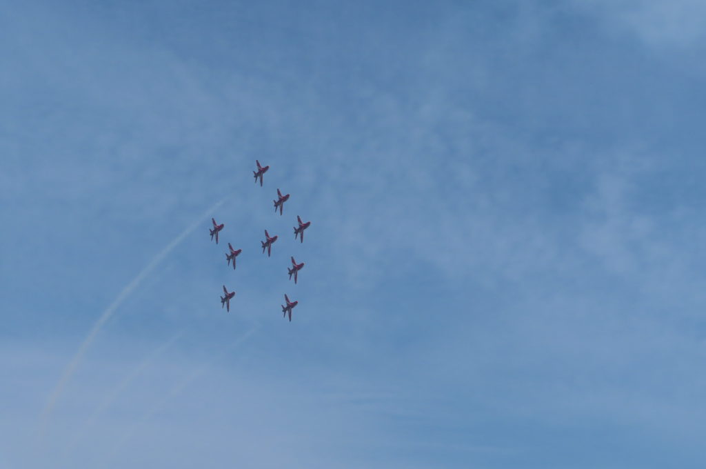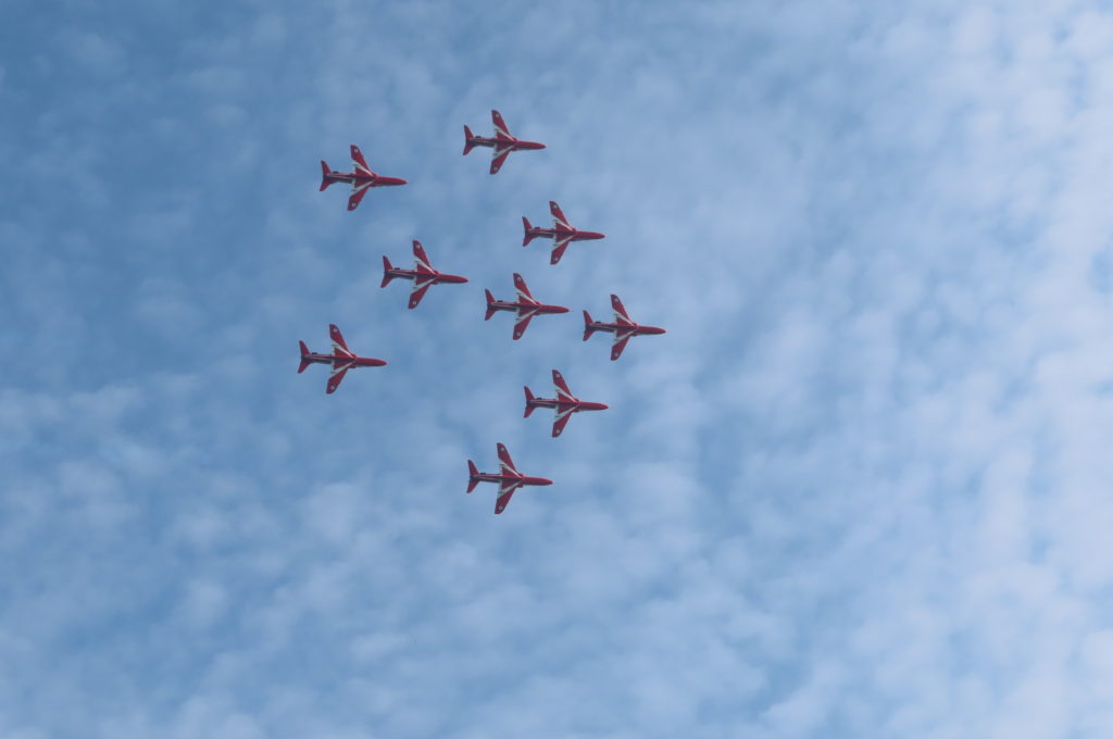 イギリス空軍のアクロバットチーム「Red Arrows」(レッドアローズ)が航空祭のオープニングを飾ります。
