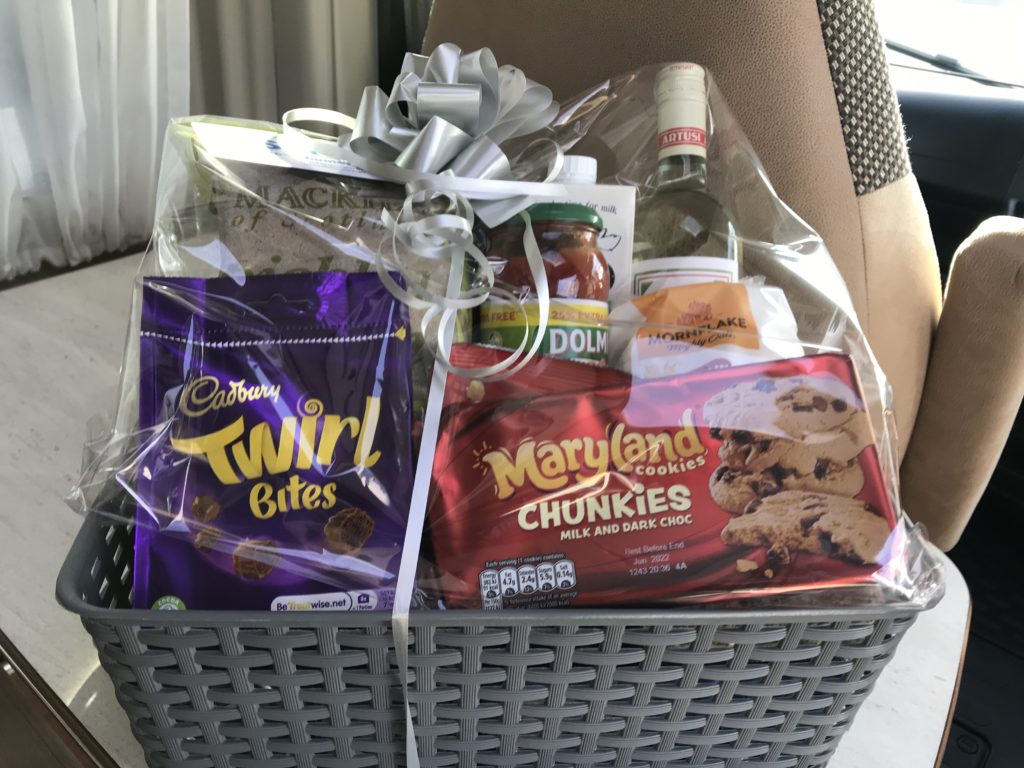 豆知識💡写真のように、かごに詰めたお菓子やお酒のギフトを英語では「hamper」(ハンパー)と呼びます。